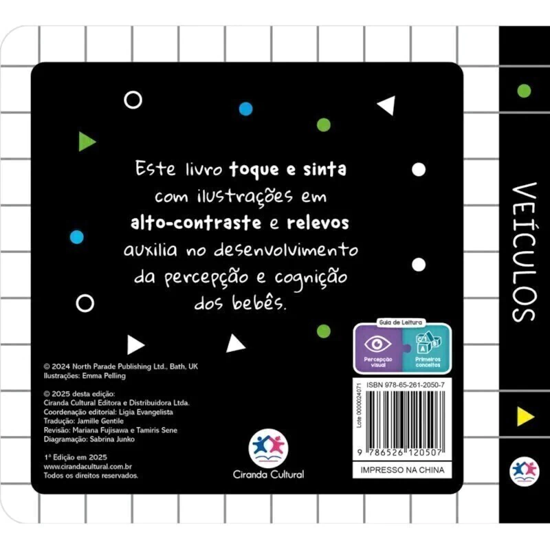 Com ilustrações de alto contraste e texturas em relevo para tocar e sentir, este livro de veículos foi criado especialmente para encantar os leitores mais pequeninos desenvolvendo a percepção e cognição!