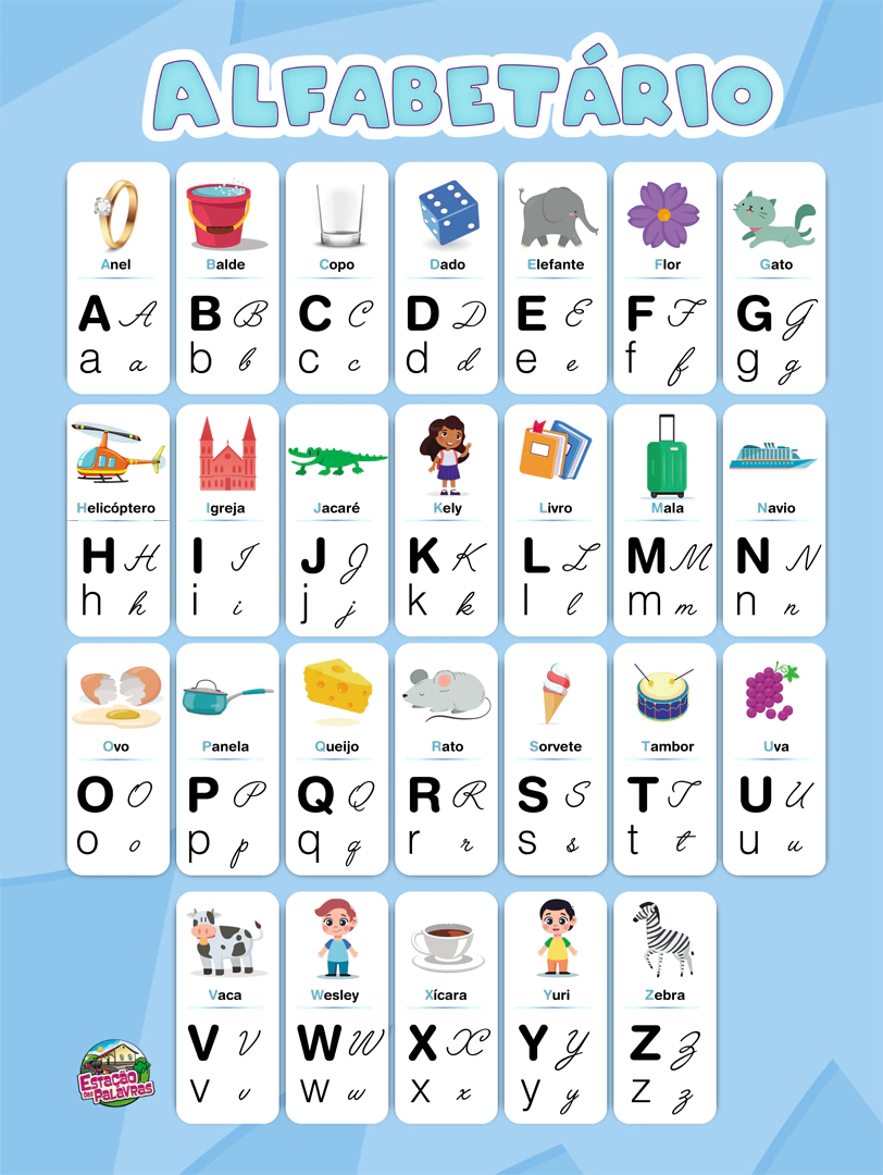 Painel com alfabeto ilustrado em 4 formas, bem didático para auxiliar o professor e facilitar o aprendizado do aluno.